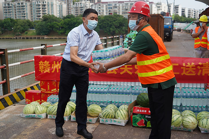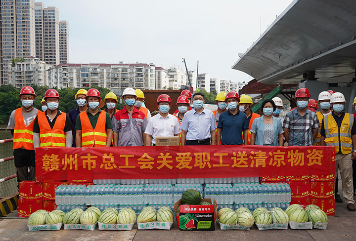 在慰問現(xiàn)場(chǎng),賴定銘一行為南河大橋拓寬改造(二期)工程項(xiàng)目高溫下堅(jiān)守崗位的一線職工發(fā)放了西瓜、礦泉水、王老吉等防暑降溫物品,并與項(xiàng)目一線職工交流談心,詢問了職工積極推進(jìn)項(xiàng)目建設(shè)進(jìn)展情況,聽取了贛州城投集團(tuán)高溫津貼發(fā)放情況和落實(shí)高溫天氣作業(yè)勞動(dòng)保護(hù)的有關(guān)措施,叮囑大家要科學(xué)安排高溫期間的施工任務(wù),要堅(jiān)持勞逸結(jié)合,特別要注意身心健康和施工安全,要認(rèn)真做好項(xiàng)目工地疫情防控工作。