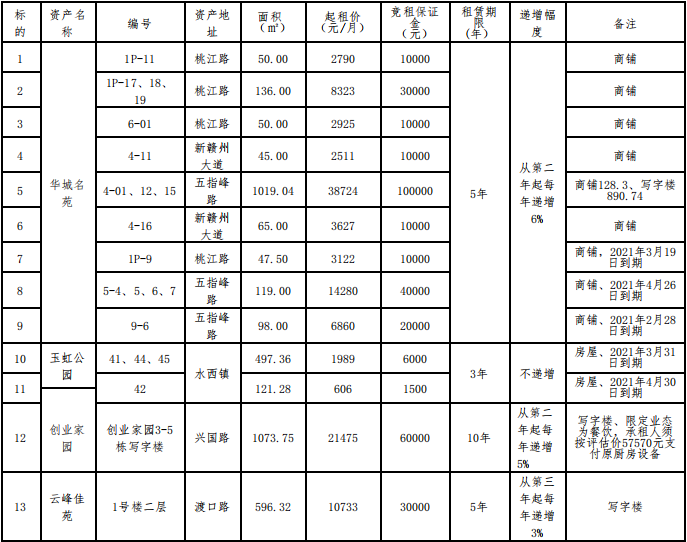 贛州振興實(shí)業(yè)有限責(zé)任公司委托江西江南拍賣有限公司,定于2021年5月28日14:30開始在贛州市公共資源交易中心(長(zhǎng)征大道9號(hào))進(jìn)行國(guó)有資產(chǎn)公開招租,現(xiàn)歡迎符合條件的單位或個(gè)人前來報(bào)名參加競(jìng)租。