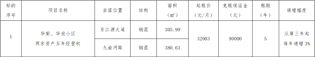 贛州振興實業(yè)有限責任公司委托江西江南拍賣有限公司,定于2021年12月21日15:00開始在江西省公共資源網(wǎng)絡交易服務平臺產權交易子系統(tǒng)通過網(wǎng)上競價公開招租華榮、華欣小區(qū)兩宗資產5年經營權,歡迎符合條件的單位和個人前來競租,現(xiàn)將有關事項公告如下:
