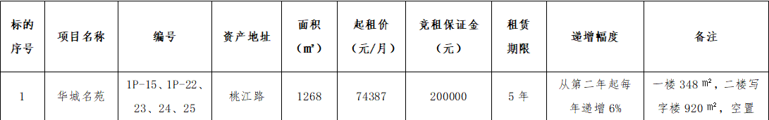 贛州振興實(shí)業(yè)有限責(zé)任公司委托江西江南拍賣有限公司,定于2021年12月17日10:00開始在江西省公共資源網(wǎng)絡(luò)交易服務(wù)平臺(tái)產(chǎn)權(quán)交易子系統(tǒng)通過網(wǎng)上競(jìng)價(jià)公開招租華城名苑1宗資產(chǎn)5年經(jīng)營權(quán)(原GZCQ2021176流拍標(biāo)的),歡迎符合條件的單位和個(gè)人前來競(jìng)租,現(xiàn)將有關(guān)事項(xiàng)公告如下: