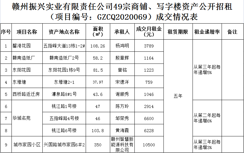 2020年10月27日上午10時,在贛州市公共資源交易中心舉行的贛州振興實業(yè)有限責(zé)任公司49宗商鋪、寫字樓資產(chǎn)公開招租(項目編號:GZCQ2020069),現(xiàn)將公開招租成交情況公示如下: