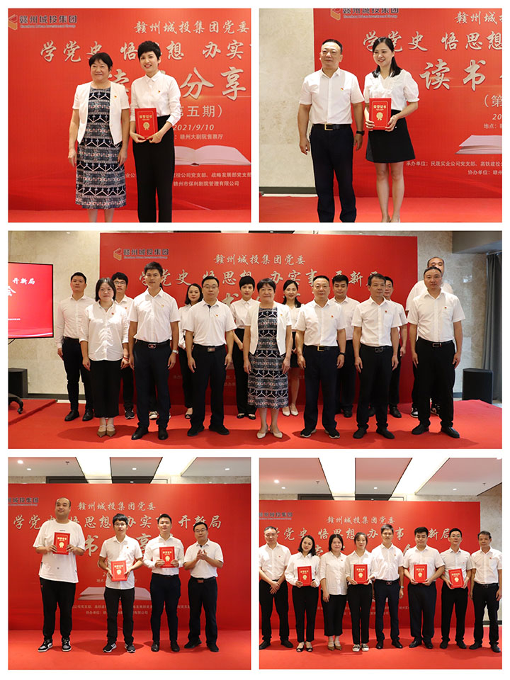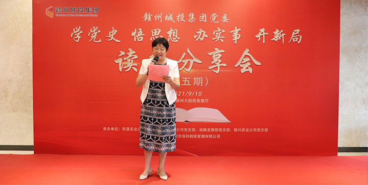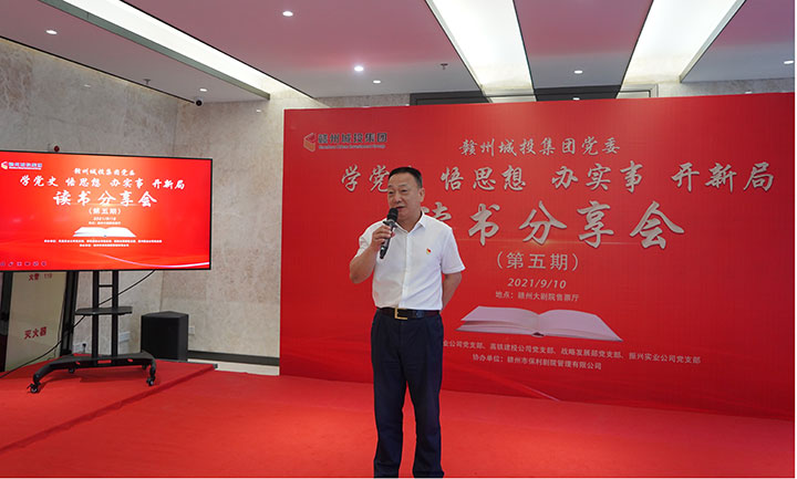 9月10日,為推動黨史學(xué)習(xí)教育有特色、出成效,贛州城投集團(tuán)黨委在贛州大劇院售票廳舉辦“學(xué)黨史 悟思想 辦實(shí)事 開新局”黨史學(xué)習(xí)教育第五期讀書分享會。市國資委二級調(diào)研員宋英蒞臨指導(dǎo),集團(tuán)黨委副書記黃家偉出席并作點(diǎn)評講話,集團(tuán)董事會秘書、集團(tuán)相關(guān)部門負(fù)責(zé)人、各黨支部書記及部分黨員參加。