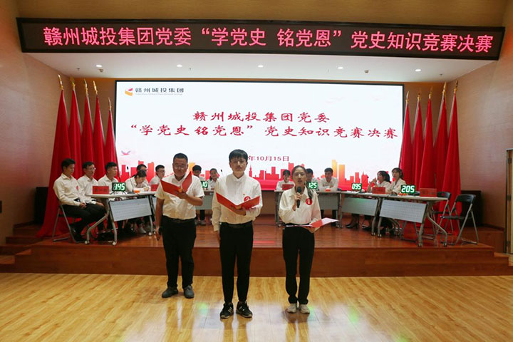 10月15日,贛州城投集團(tuán)黨委舉辦"學(xué)黨史 銘黨恩"黨史學(xué)習(xí)教育知識競賽決賽。市國資委黨委黨史學(xué)習(xí)教育領(lǐng)導(dǎo)小組副組長、黨委委員、副主任黃曉東,市委組織部組織三科科長賴雯龍,市委黨史研究室正科級干部陳曄明,市委黨史研究室宣教科臨時(shí)負(fù)責(zé)人許偉卿應(yīng)邀到場指導(dǎo)。集團(tuán)黨委書記、董事長提名人選劉曉方,集團(tuán)黨委副書記、總經(jīng)理提名人選郭閩軍及其他黨員高管出席活動。來自集團(tuán)各黨支部(黨總支)的6支代表隊(duì)的參賽選手及黨員、群眾代表等共約90人參加。