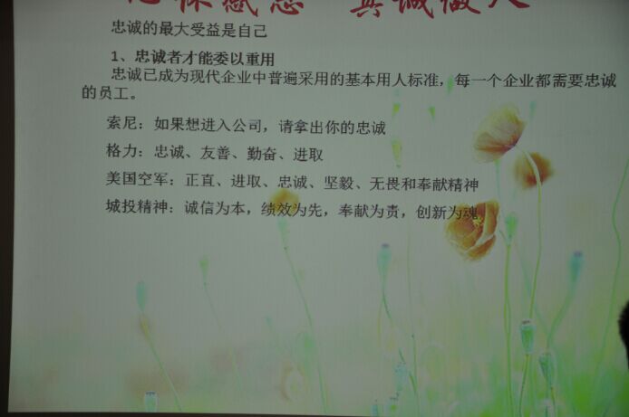 我們城投精神的16字方針:誠(chéng)信為本,績(jī)效為先,奉獻(xiàn)為責(zé),創(chuàng)新為魂。誠(chéng)信其中一個(gè)表現(xiàn)就是忠誠(chéng)。